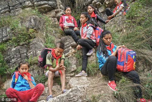 5月14日是家長(zhǎng)接孩子的日子,清晨6點(diǎn)多,30多歲的陳古吉帶著背包繩和另外兩個(gè)家長(zhǎng)一起下山接孩子。村里身手敏捷的年輕人,下山通常需要1小時(shí),上山大約90分鐘,對(duì)于外來(lái)的人,通常是這個(gè)時(shí)間的兩倍。圖片來(lái)源:視覺中國(guó)