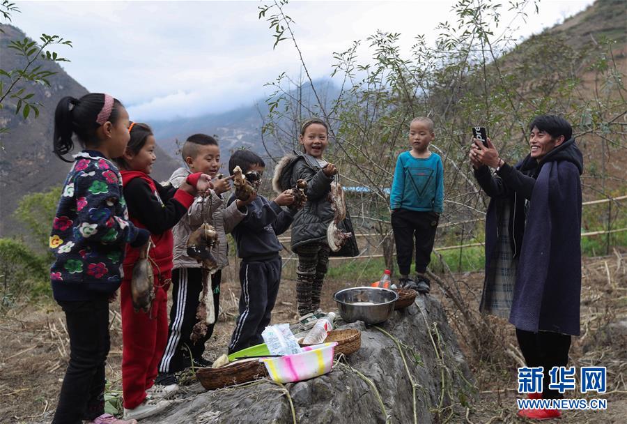 11月24日,在昭覺縣支爾莫鄉(xiāng)阿土列爾村,村民阿牛用手機拍攝孩子們向大家拜年的視頻。新華社記者江宏景攝