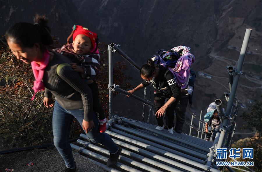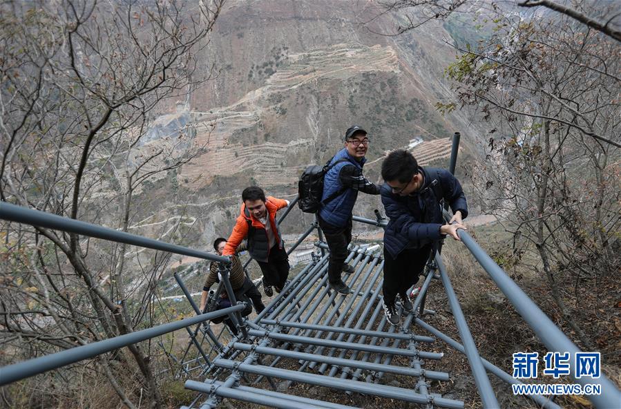 阿土列爾村彝族小伙莫色爾伍(右)在鋼梯上行走(11月23日攝)。新華社記者江宏景攝