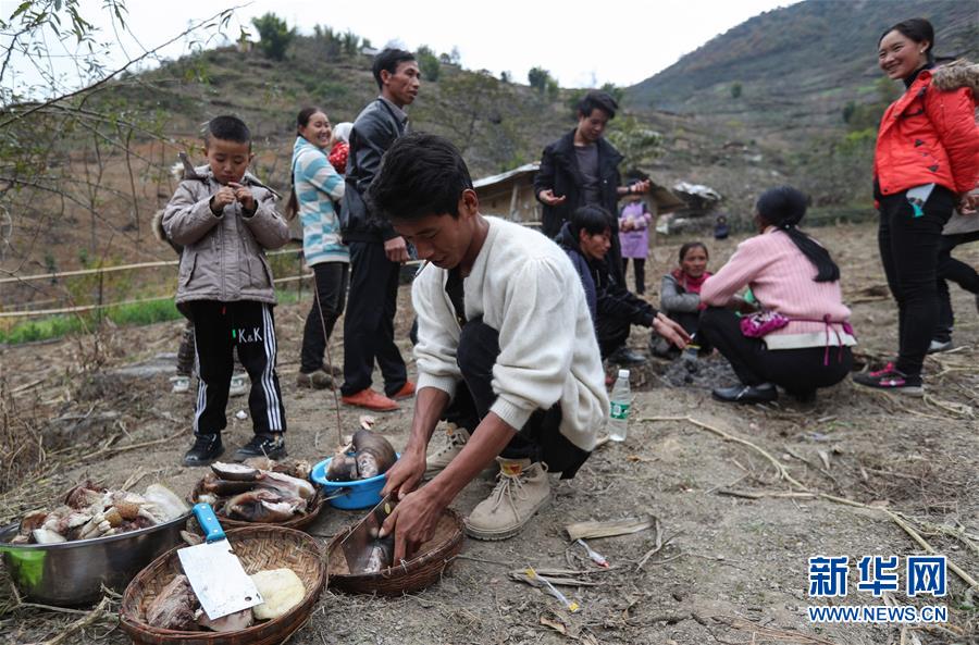 11月24日,在昭覺縣支爾莫鄉(xiāng)阿土列爾村,當?shù)鼐用駵蕚涫焓场⒕频仁澄锛雷?,并相互贈送?1月20日至26日是四川省涼山彝族自治州大小涼山彝族群眾傳統(tǒng)節(jié)日——彝族年,懸崖上的阿土列爾村的彝族群眾殺年豬、祭祀和走親拜年,慶祝一年一度的彝族年。阿土列爾村是“懸崖村”,位于四川省涼山彝族自治州昭覺縣支爾莫鄉(xiāng),坐落在海拔1400-1600米山坳中,這里居住著60多戶彝族群眾,村民走出大山,需要攀爬懸崖。新華社記者江宏景攝