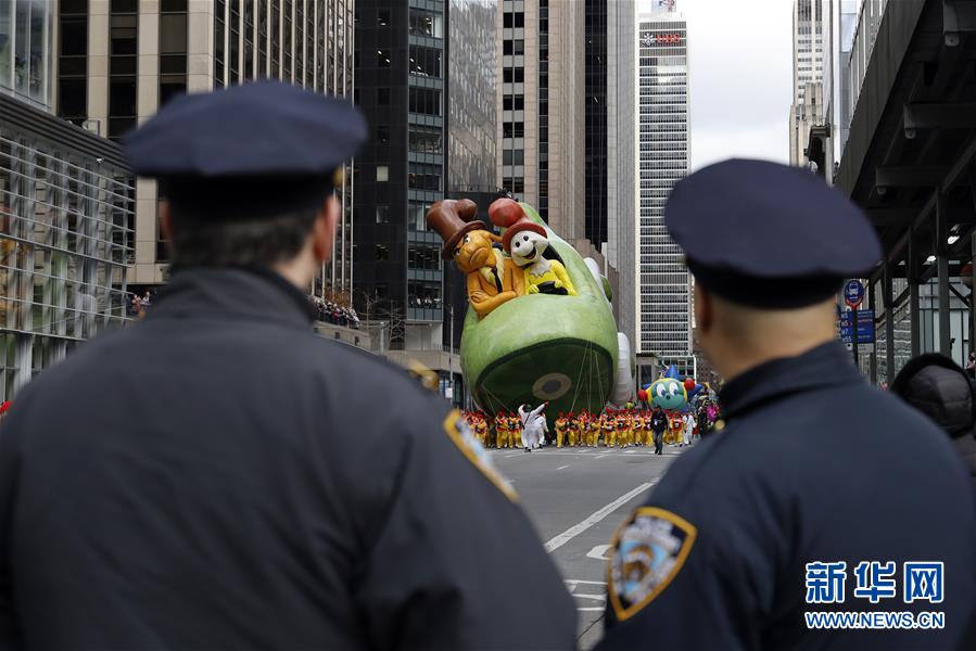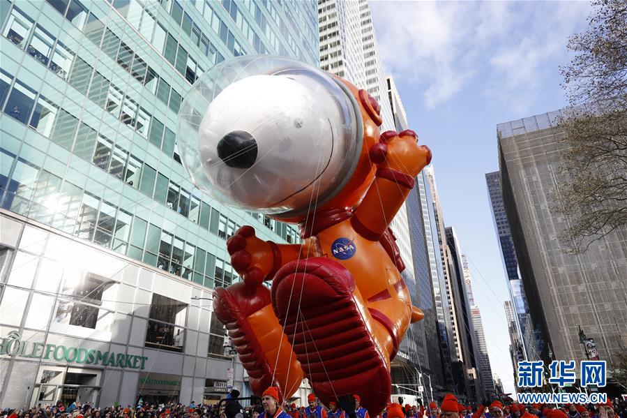 11月28日,在美國紐約舉行的感恩節(jié)大游行上,卡通氣球行進在曼哈頓街頭。 新華社記者 李木子 攝
