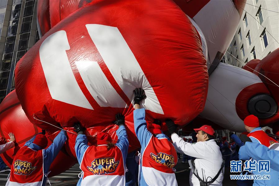 11月28日,在美國紐約舉行的感恩節(jié)大游行上,工作人員試圖控制氣球。 新華社記者 李木子 攝