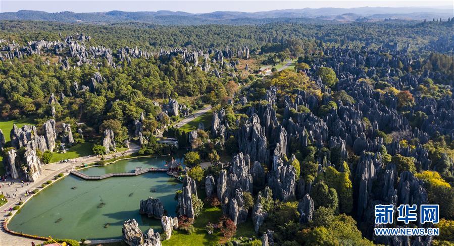 11月28日,空中俯瞰石林景區(qū)(無(wú)人機(jī)拍攝)。新華社記者江文耀攝