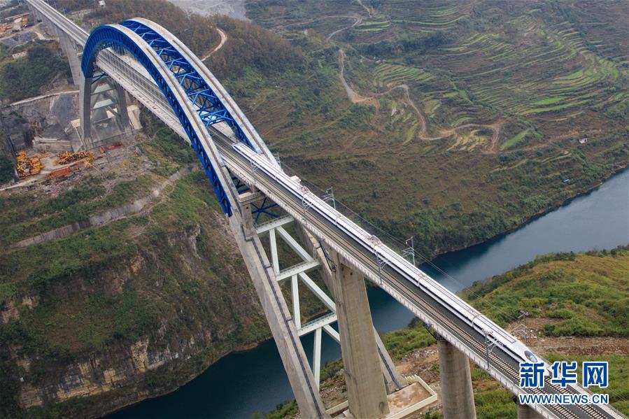 12月2日,一輛試驗(yàn)列車駛過成貴高鐵鴨池河特大橋。新華社記者劉續(xù)攝