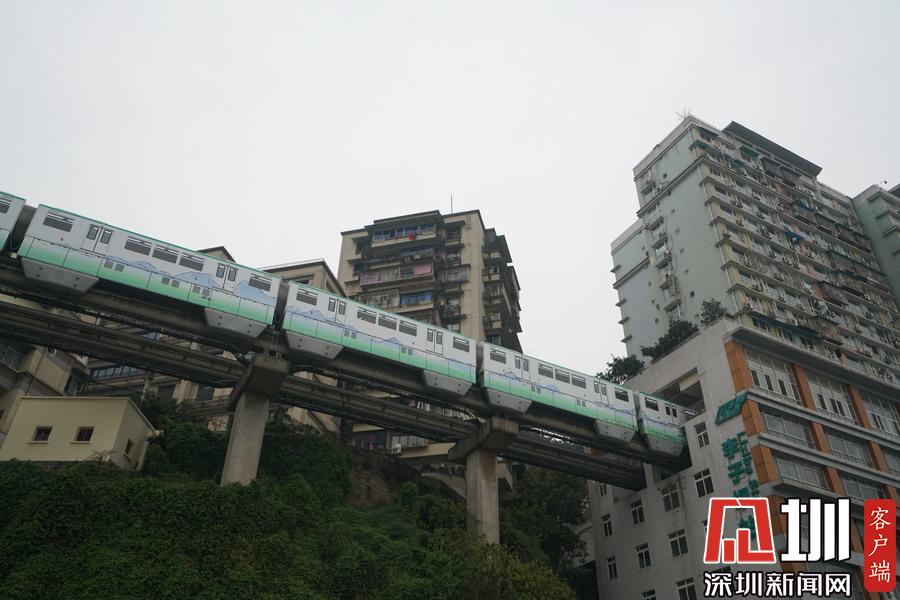 2019年6月25日,重慶渝中區(qū),軌道交通2號線列車從一小區(qū)的6層“螺旋”停車場上方穿過,顯得十分“魔幻”。圖為高處拍攝的軌道交通2號線。