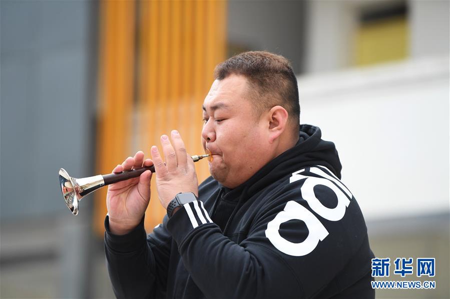 12月12日,文藝志愿者在中益鄉(xiāng)小學演奏嗩吶。新華社記者 王全超 攝