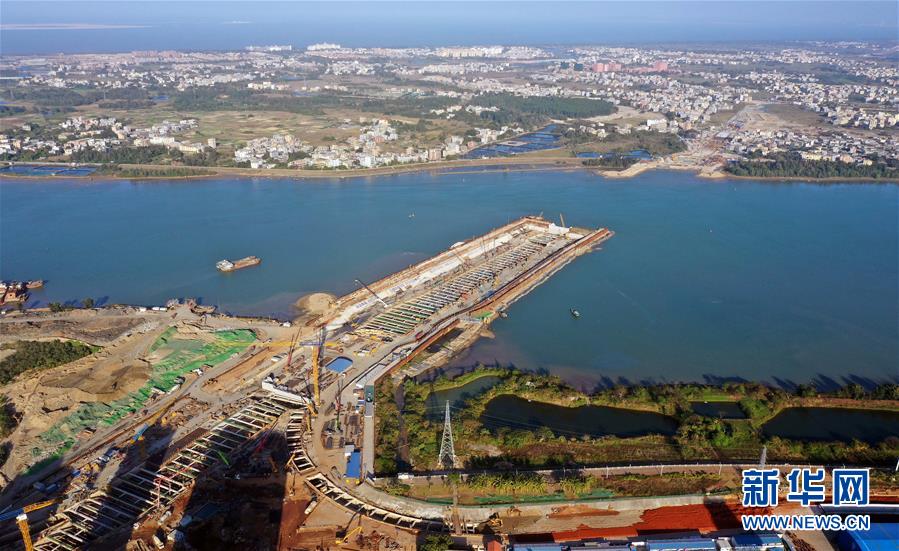 正在施工的海口文明東越江通道項(xiàng)目(12月14日無人機(jī)拍攝)。  新華社記者 郭程 攝