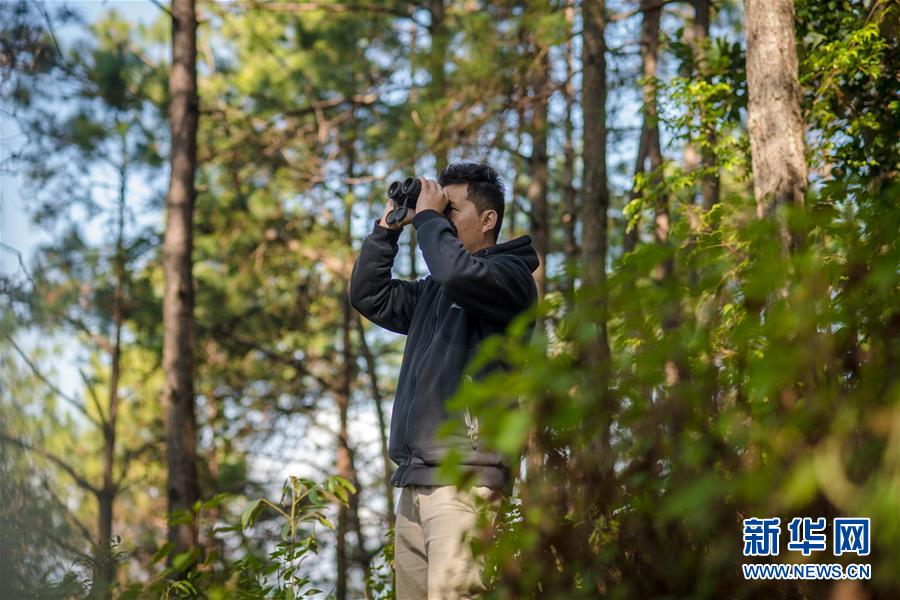 羅康在哀牢山的松樹林里觀測鳥類(12月12日攝)。 新華社記者 胡超 攝