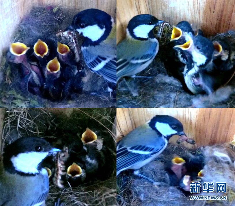 拼版照片:羅康在人工巢箱里安裝的錄像設(shè)備拍攝到鳥類在以松毛蟲喂食幼鳥(資料照片)。 新華社發(fā)