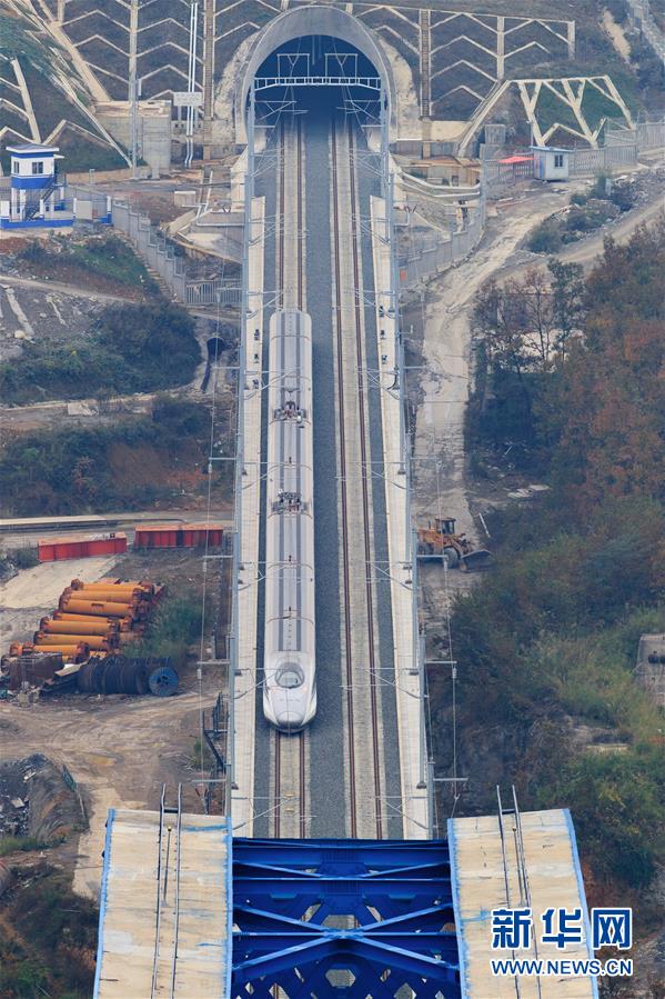 12月2日,一輛試驗列車駛過成貴高鐵鴨池河特大橋。新華社記者劉續(xù)攝