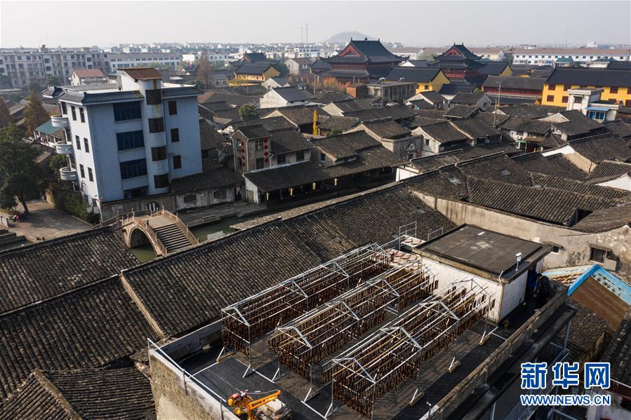 12月3日,安昌古鎮(zhèn)傳統(tǒng)臘味作坊里曬滿了各種手工制作的紹興臘味(無人機拍攝)。新華社記者徐昱攝