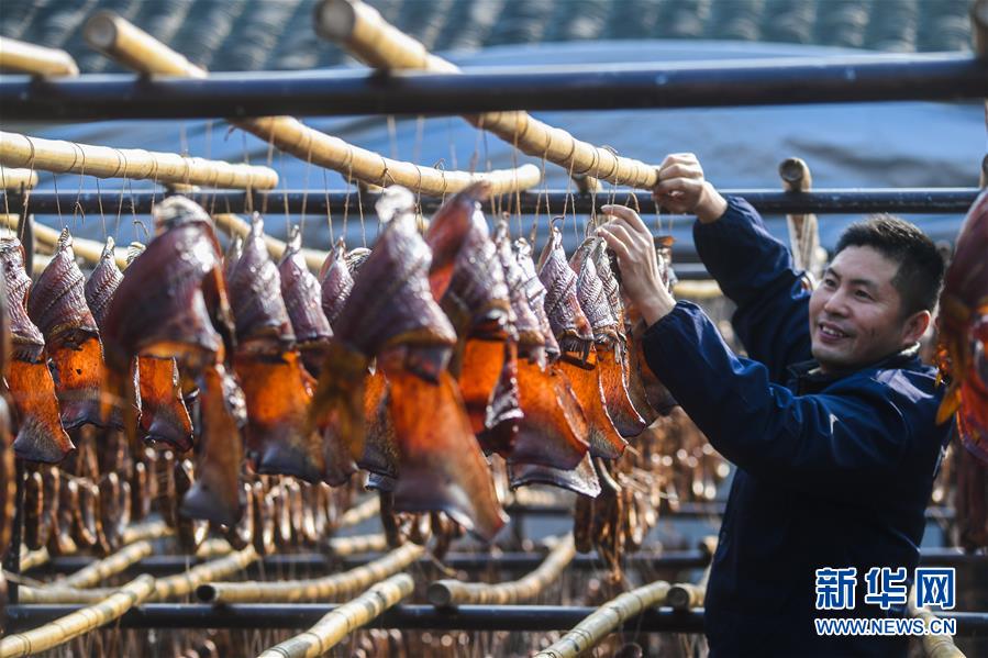 12月3日,安昌古鎮(zhèn)一家名為阿紅香腸的傳統(tǒng)臘味作坊里的工作人員在晾曬各種手工制作的紹興臘味。新華社記者徐昱攝