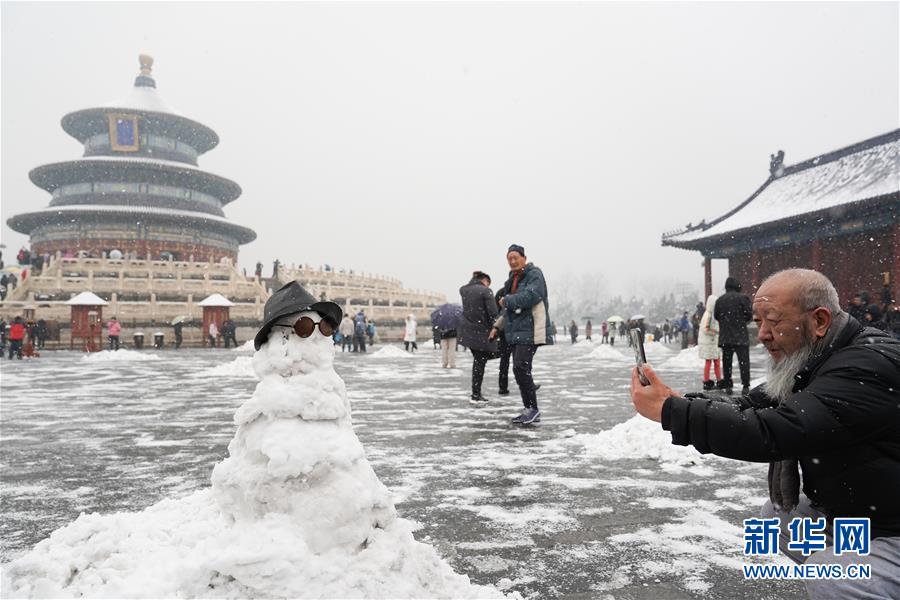 12月16日,在北京天壇公園,一名游客拍攝雪人。當(dāng)日,北京迎來降雪天氣。新華社記者鞠煥宗攝
