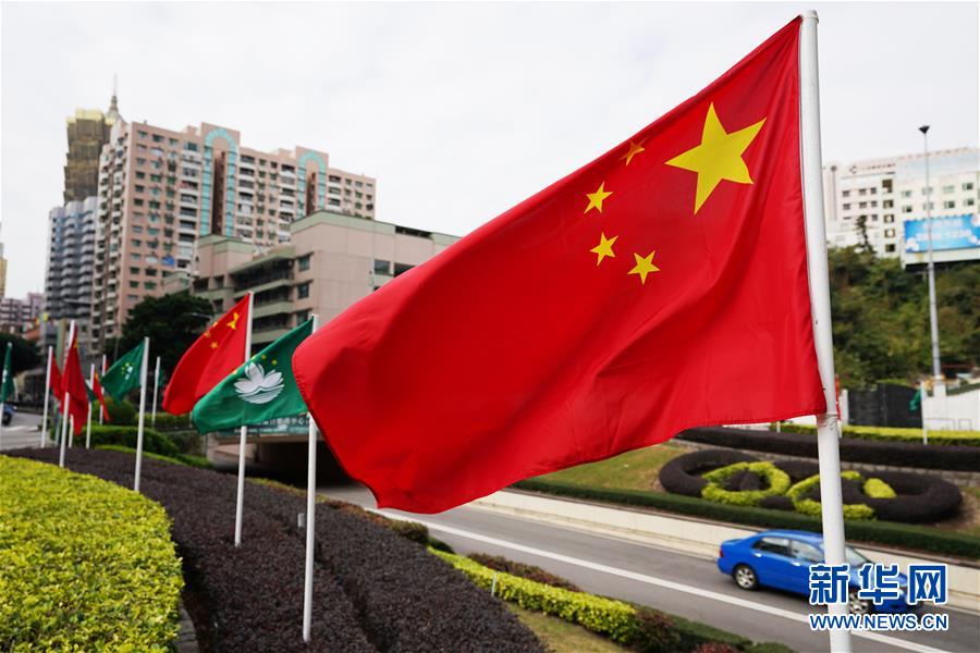 12月17日,在澳門街頭,國旗和區(qū)旗迎風飄揚。