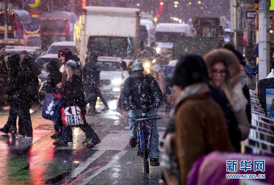 12月18日,在美國紐約時(shí)報(bào)廣場,一名男子冒雪騎行。