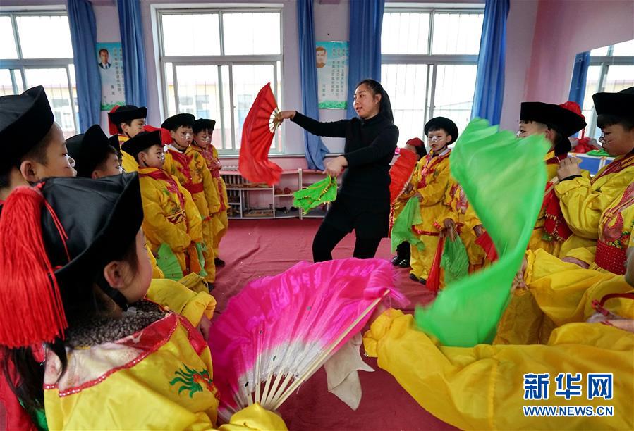 12月19日,河北省灤州市小閆營小學(xué)教師在為學(xué)生示范地秧歌動(dòng)作要領(lǐng)。新華社記者 牟宇 攝