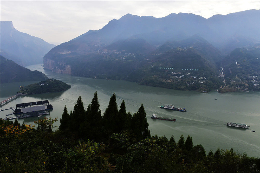 2019年11月3日,重慶,各種上行船舶正在通過白帝城前方的三峽夔門,蓄水后貨暢其流、往來無阻的水運業(yè)彰顯“黃金水道”的社會效益。