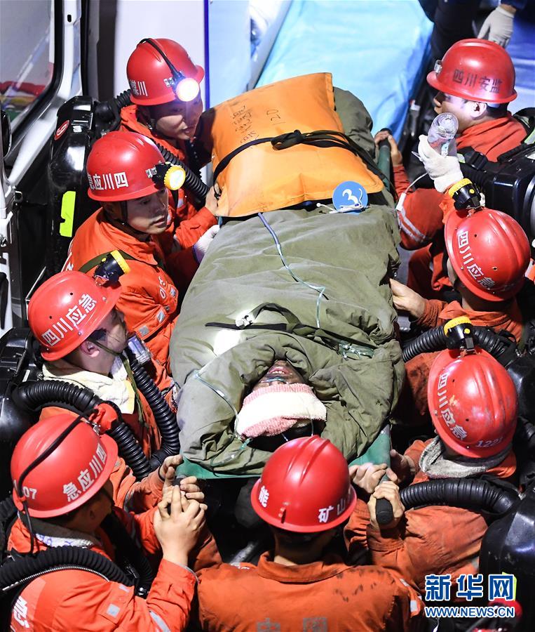 12月18日,救援人員轉(zhuǎn)運(yùn)安全升井的被困人員。 當(dāng)日7時(shí)56分,經(jīng)過(guò)80多個(gè)小時(shí)的緊張救援,發(fā)生透水事故的川煤集團(tuán)杉木樹煤礦13名被困人員全部安全升井。 新華社記者 薛玉斌 攝