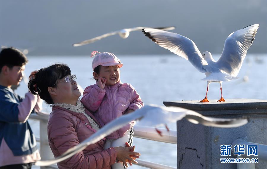 12月18日,人們?cè)诶ッ骱9〈髩斡^賞、投喂紅嘴鷗。 近日,“春城”昆明陽(yáng)光明媚,氣候宜人,市民游客紛紛來(lái)到海埂大壩、翠湖公園等地,與前來(lái)越冬的紅嘴鷗近距離接觸,人鷗同樂(lè)。紅嘴鷗是云南昆明的“榮譽(yù)市民”,每年秋冬季都會(huì)來(lái)到昆明越冬。 新華社記者 藺以光 攝