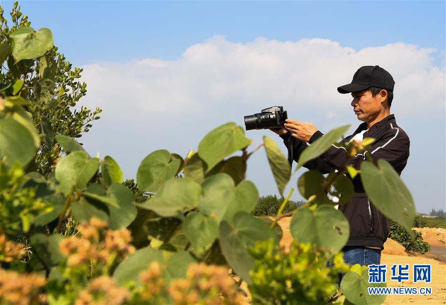 海南新盈紅樹林國家濕地公園巡護員兼監(jiān)測員羅理想在濕地公園內(nèi)拍攝紅樹林(12月11日攝)。 羅理想2006年起開始參與紅樹林濕地的保護工作,近年來他參加了很多關(guān)于濕地的培訓(xùn)。2016年,羅理想在工作中監(jiān)測到極危鳥種勺嘴鷸,當(dāng)時有許多媒體做了報道,后來他又配合專家在濕地公園里發(fā)現(xiàn)了拉氏紅樹,“那個時候感覺自己的工作很有價值”,羅理想說。新華社記者楊冠宇攝
