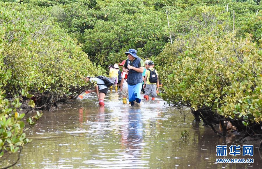 海南東寨港國家級自然保護區(qū)林業(yè)工程師馮爾輝(前)在保護區(qū)內(nèi)為學(xué)生進行講解(7月16日攝)。 馮爾輝2009年大學(xué)畢業(yè)后來到保護區(qū)工作,小時候他家就住在紅樹林邊上,他從小和紅樹林打交道,喜歡動植物和鳥類。外貿(mào)專業(yè)畢業(yè)的他邊工作邊學(xué)習(xí),目前主要從事鳥類監(jiān)測、紅樹林保育、自然教育等工作?!凹t樹林看著我長大”,馮爾輝說,濕地保護的工作非常有意義。 新華社發(fā)