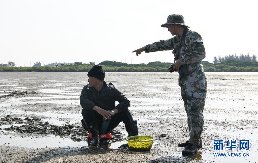 海南儋州新英灣紅樹林市級自然保護區(qū)護林員陳正平(右)在保護區(qū)內(nèi)的灘涂上向村民普及紅樹林濕地相關(guān)知識(12月10日攝)。陳正平2010年開始在保護區(qū)工作,他將工作發(fā)展成愛好,廣泛參加各種培訓(xùn)和業(yè)內(nèi)交流。他在工作中拍到瀕危鳥類白肩雕出現(xiàn)在海南的照片,這刷新了海南省的鳥種記錄。新華社記者楊冠宇攝