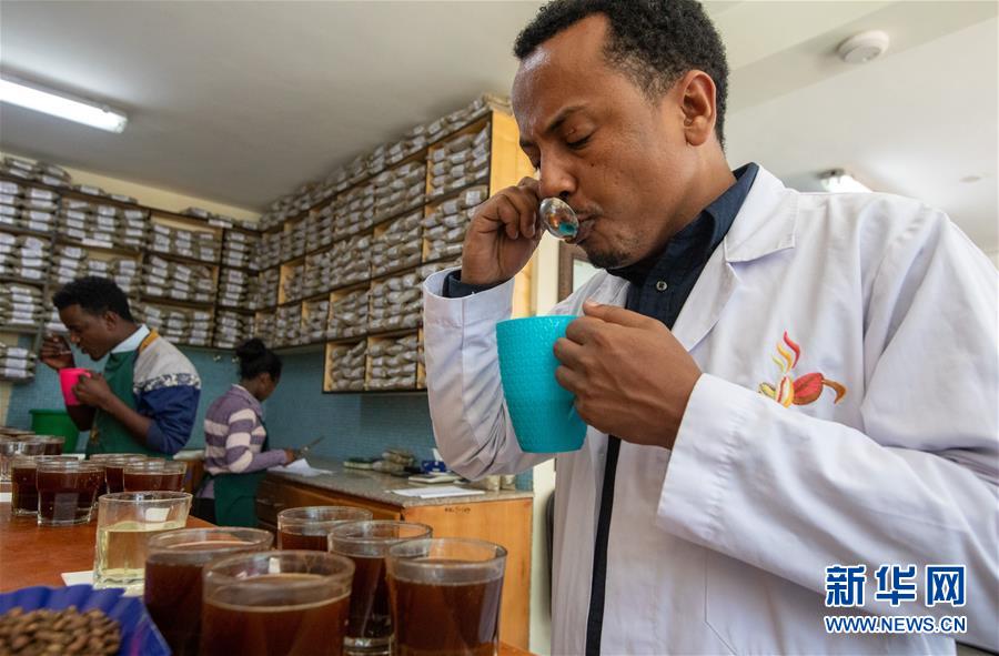 2019年10月23日,在位于埃塞俄比亞首都亞的斯亞貝巴郊外的卡辰什咖啡加工廠內(nèi),卡辰什咖啡質(zhì)量和市場總監(jiān)阿斯納克·卡薩在杯測室參與咖啡的杯測??ǔ绞部Х仁前H肀葋喿畲蟮目Х壬a(chǎn)商和出口商之一。卡薩表示,中國市場潛力巨大,埃塞俄比亞咖啡在中國市場的占有率不斷增長,進博會對埃塞俄比亞咖啡出口商來說是一個很好的機會。 新華社記者 張宇 攝