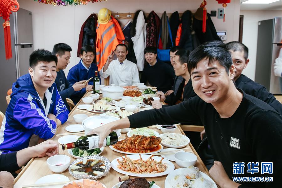 2019年2月5日,在比利時安特衛(wèi)普港,船員們在“中遠海運天秤座”號餐廳里共享遲來的年夜飯。由于駛離漢堡港的時間出現(xiàn)延誤,超大型集裝箱船“中遠海運天秤座”號在2月5日農(nóng)歷正月初一凌晨兩點才抵達安特衛(wèi)普港,遠洋海員們終于可以開懷暢飲,歡喜過年。 新華社記者 張鋮 攝