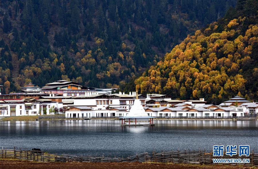 西藏波密縣境內(nèi)古鄉(xiāng)湖畔的雪山、彩林和民居(10月25日攝)。新華社記者陳天湖攝