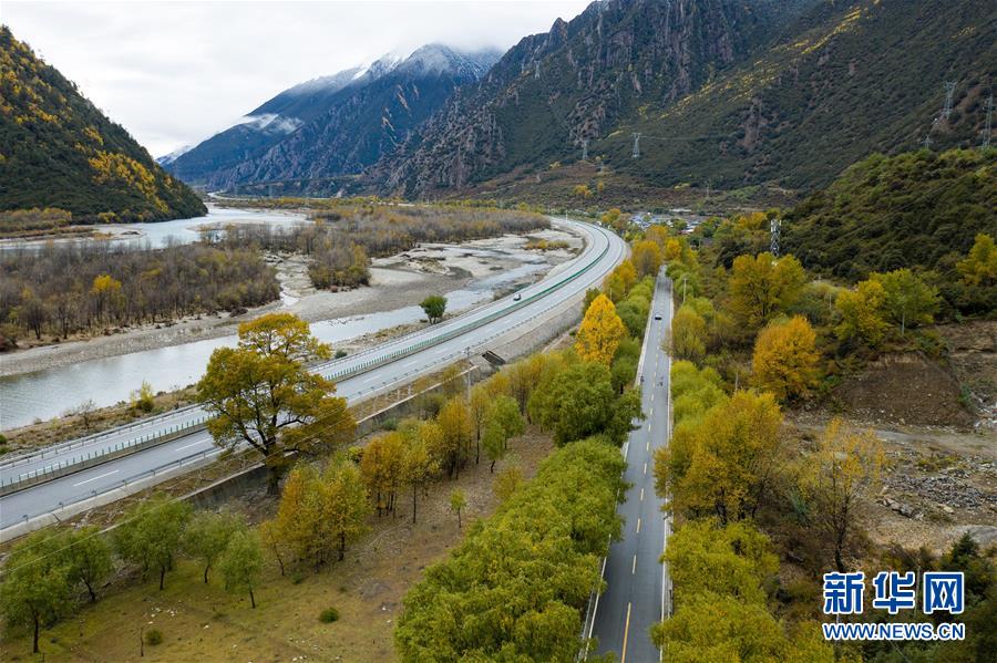 這是318國道西藏林芝市尼洋河谷段(10月27日無人機(jī)拍攝)。新華社記者江宏景攝