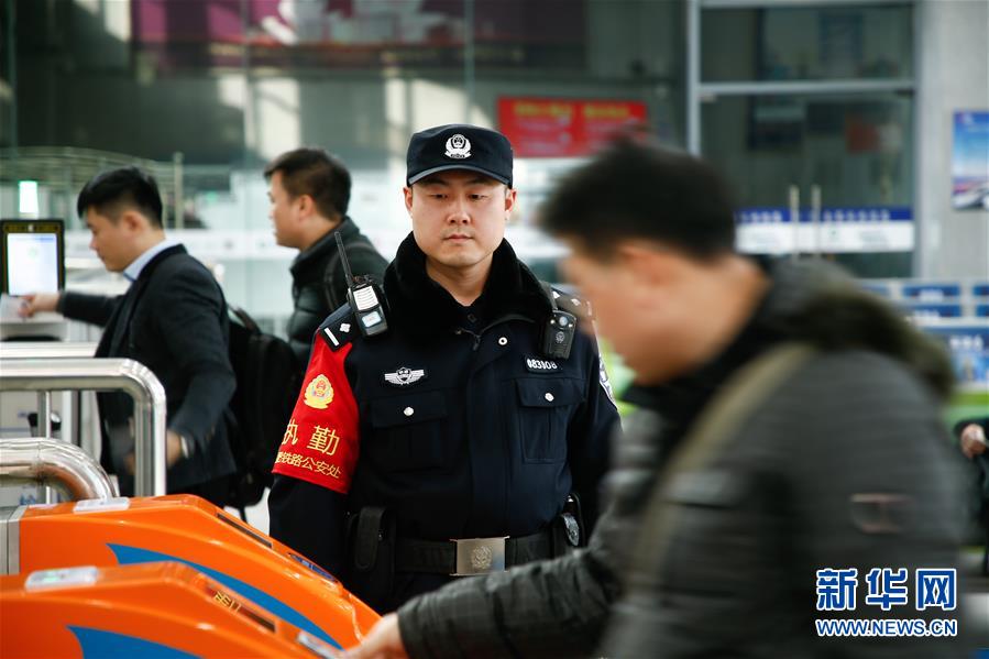 金寨火車(chē)站派出所民警張嗣一(右二)在檢票口執(zhí)勤(12月19日攝)。新華社記者陳立群攝