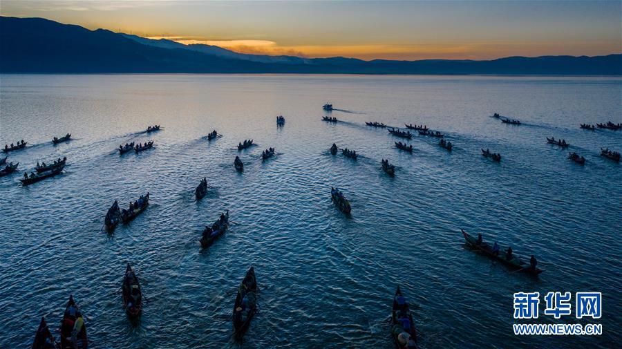 12月25日,漁船駛?cè)胄窃坪o(wú)人機(jī)拍攝)。當(dāng)日,位于云南省玉溪市江川區(qū)的星云湖迎來(lái)一年一度的開(kāi)湖捕魚(yú)季,600余艘漁船駛?cè)胄窃坪稉啤P窃坪窃颇鲜【糯蟾咴粗?,本次開(kāi)湖捕魚(yú)時(shí)間將從2019年12月25日持續(xù)至2020年1月23日。新華社記者胡超攝