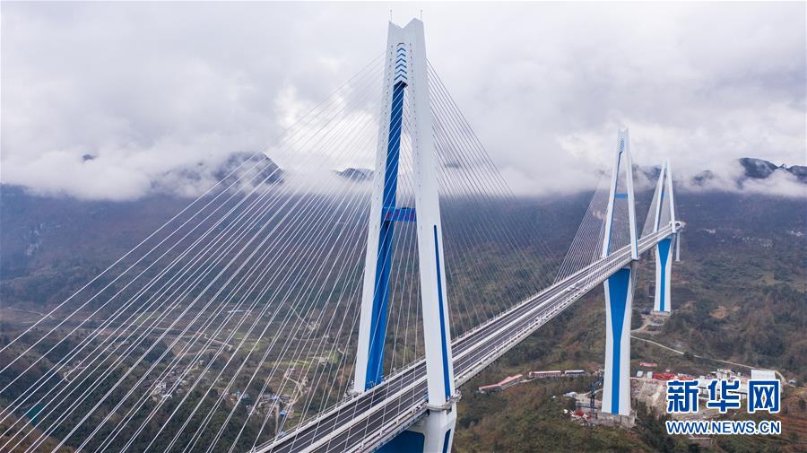 2019年1月7日無人機(jī)航拍的平塘特大橋橋塔全景,中為高332米的世界第一高混凝土橋塔。新華社記者歐東衢攝