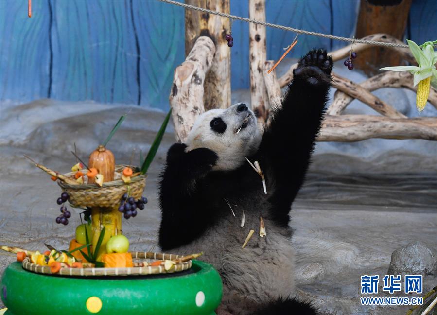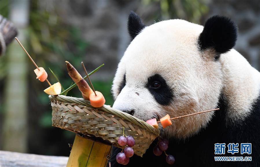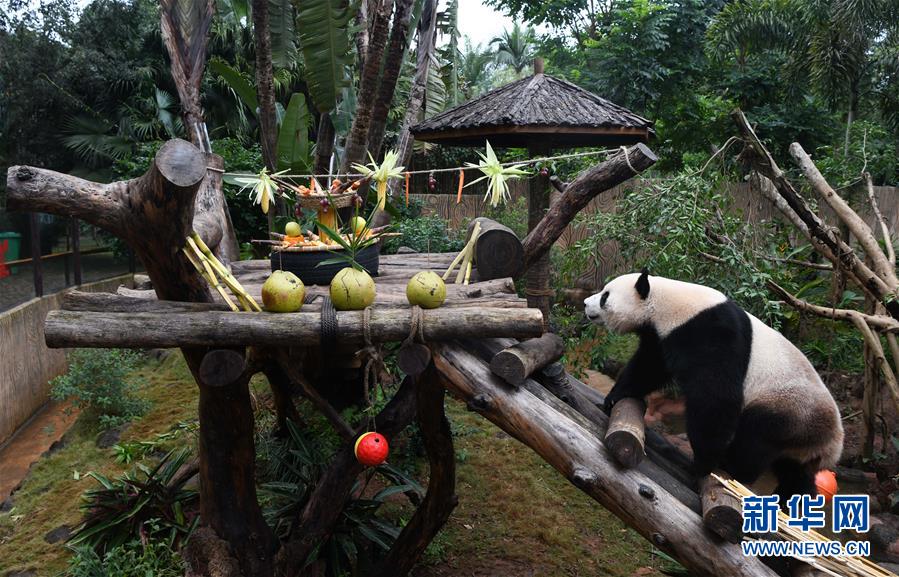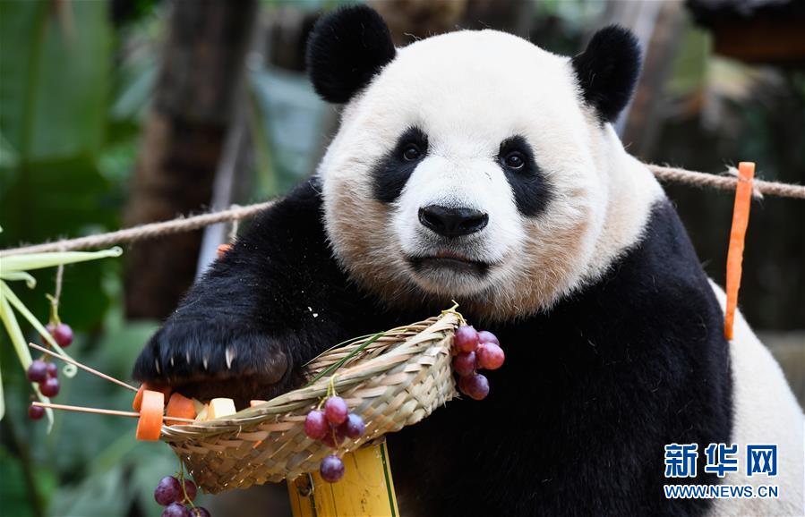 當(dāng)日是2019年最后一天,海南熱帶野生動(dòng)植物園的工作人員為園區(qū)內(nèi)大熊貓“貢貢”“舜舜”準(zhǔn)備了用葡萄、南瓜、竹筍等果蔬制作的“火鍋串串香”,讓它們用“擼串”的方式迎接新年的到來(lái)。 新華社記者 楊冠宇 攝