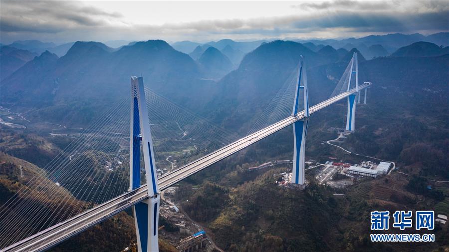 2019年1月7日無人機航拍的平塘特大橋橋塔全景,中為高332米的世界第一高混凝土橋塔。新華社記者歐東衢攝