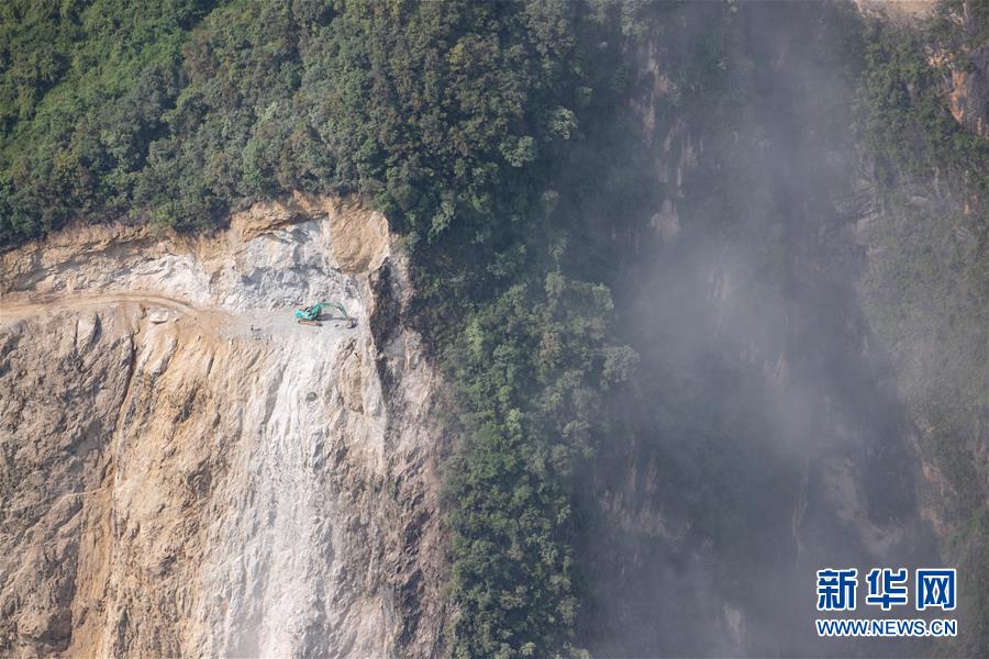一輛挖掘機在阿布洛哈村懸崖修建通村公路(2019年7月18日攝)。新華社記者江宏景攝