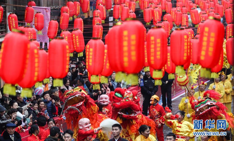 1月1日在四川省雅安市上里古鎮(zhèn)拍攝的“年豬節(jié)”獅燈表演。新華社記者 江宏景 攝