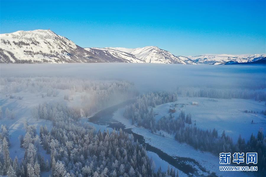 這是1月3日拍攝的喀納斯河畔的霧凇景觀(無人機照片)。新華社記者宋彥樺攝