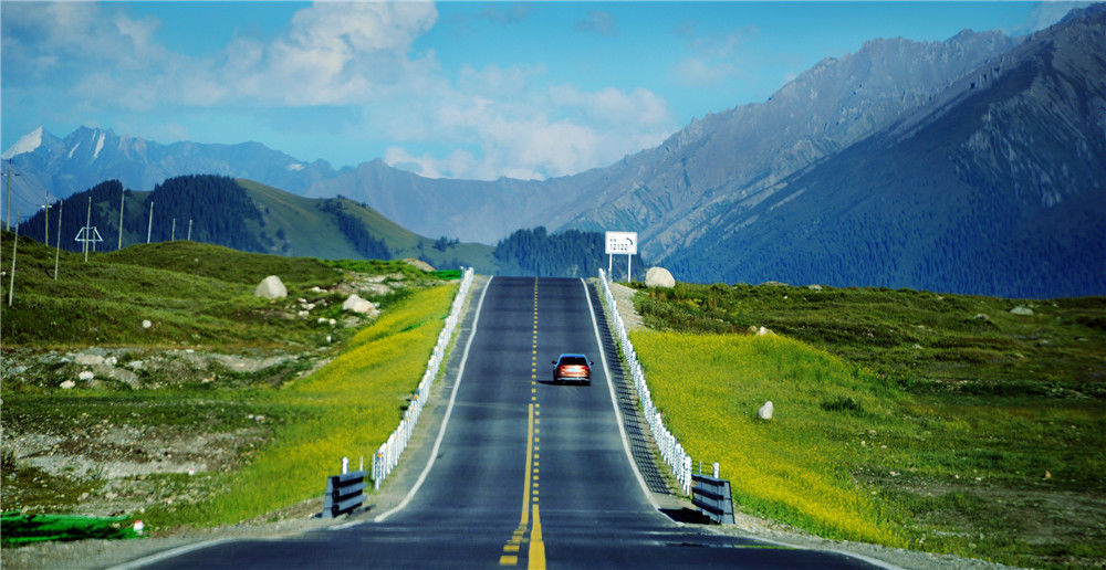 2019年7月10日,新疆獨庫公路蜿蜒在天山山脈的草原山谷中。黃光浩/視覺中國