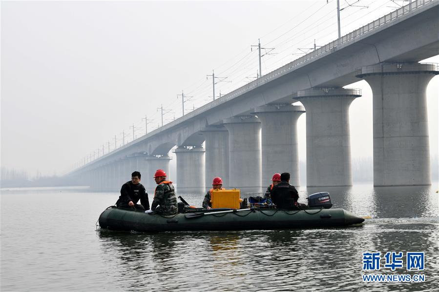 1月3日,中國鐵路濟(jì)南局鐵道戰(zhàn)備舟橋處工程人員準(zhǔn)備船只前往預(yù)定地點(diǎn)檢查橋墩。