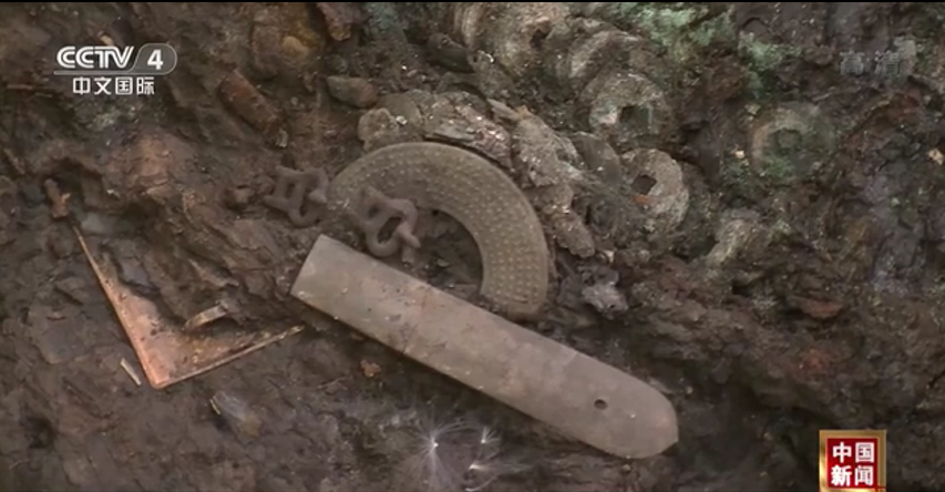 銅器有:鼎、鈁、豆、匙、盤、甑、釜等。西側(cè)邊箱被盜,余少量銅器及少量漆器殘跡。器形有銅鑒、銅洗、銅燈。此外,西側(cè)回廊北端分布玉器,數(shù)量較多。有玉圭、玉壁等。