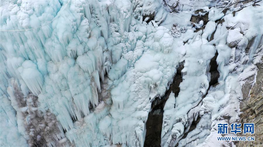 這是1月7日拍攝的賀蘭山巖畫景區(qū)內的冰瀑景觀(無人機照片)。近日,寧夏賀蘭山巖畫景區(qū)內,自然山泉凍結冰瀑和人造冰瀑景觀相結合,形成多處冰瀑景觀,山間形態(tài)各異的冰掛、冰柱鬼斧神工,蔚為壯觀,吸引眾多游客前來觀賞。 新華社記者 王鵬 攝