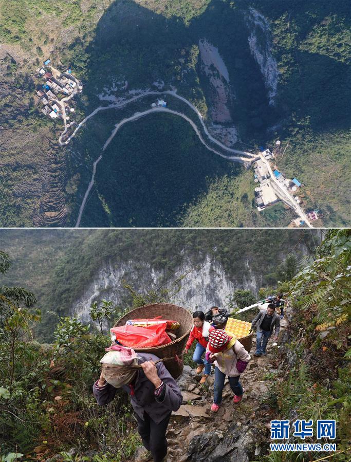 拼版照片:上圖為已經修通水泥路的大化瑤族自治縣板升鄉(xiāng)八好村八好屯(2019年11月11日無人機拍攝);下圖為在尚未通路前,八好村八好屯村民背著年貨走山路回家(2016年1月26日攝)。新華社記者黃孝邦攝