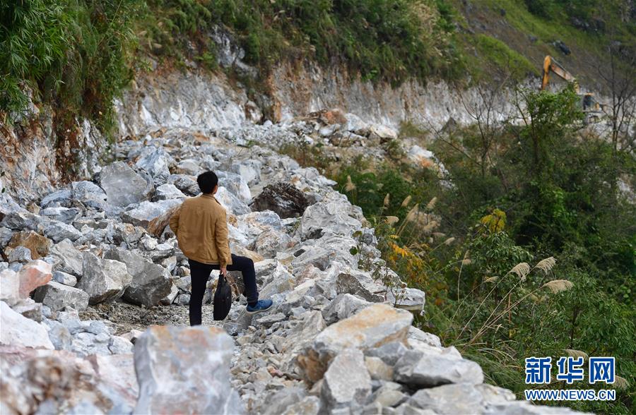 八好村駐村第一書記韋德徒步前往弄麻屯開展扶貧工作,弄麻屯的公路尚在建設當中(2019年12月16日攝)。新華社記者黃孝邦攝