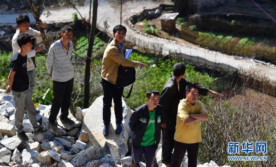 八好村駐村第一書記韋德王(中)在弄豪屯推進(jìn)水柜項目建設(shè)進(jìn)度(2019年12月16日攝)。新華社記者黃孝邦攝