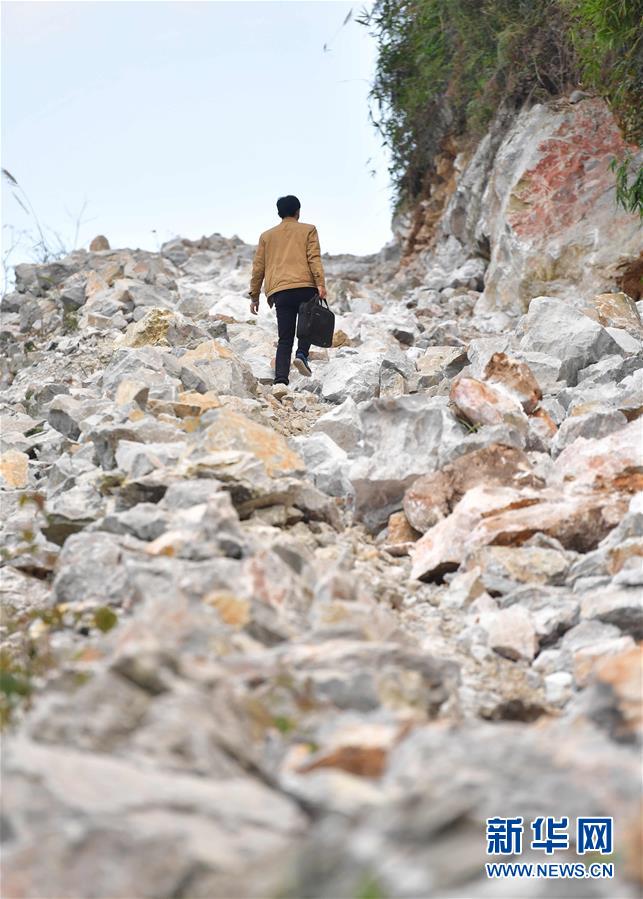 八好村駐村第一書記韋德徒步前往弄麻屯開展扶貧工作,弄麻屯的公路尚在建設當中(2019年12月16日攝)。新華社記者黃孝邦攝