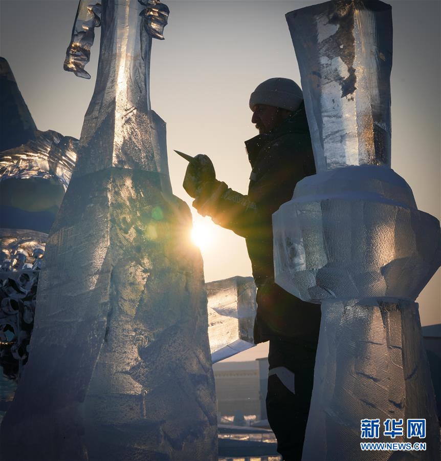 第九屆中國(guó)·哈爾濱國(guó)際組合冰雕比賽選手在哈爾濱冰雪大世界內(nèi)制作冰雕(1月2日攝)。新華社記者王松攝