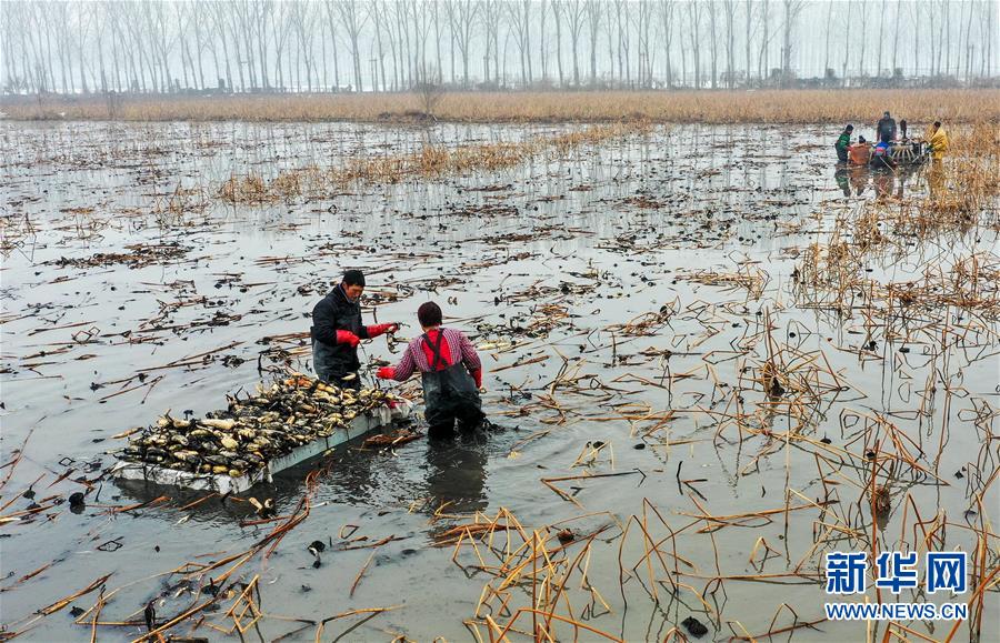 1月10日,村民在磁縣禾下土白蓮藕立體種養(yǎng)基地采收蓮藕。 新華社記者 王曉 攝