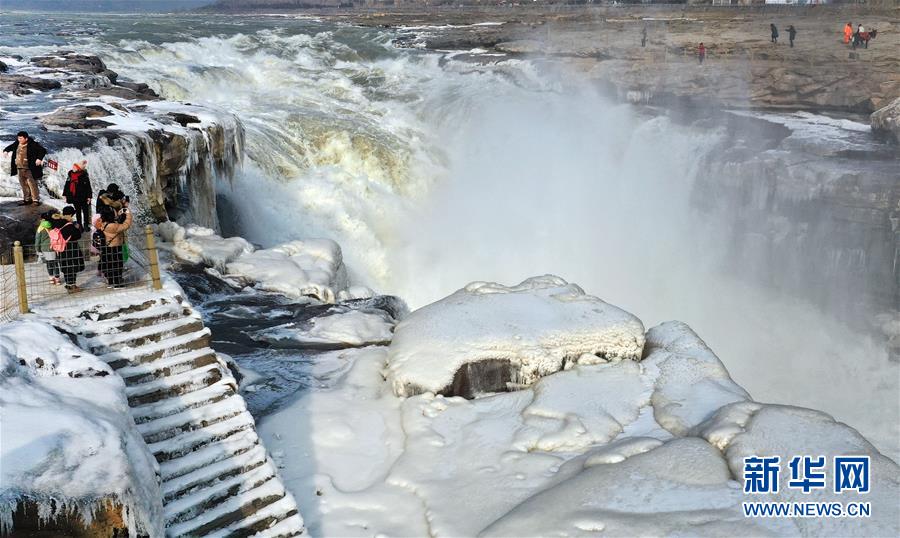 1月12日,游人在陜西黃河壺口瀑布景區(qū)游覽(無人機照片)。新華社記者陶明攝