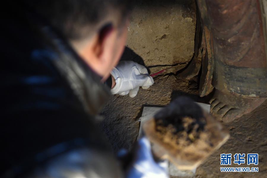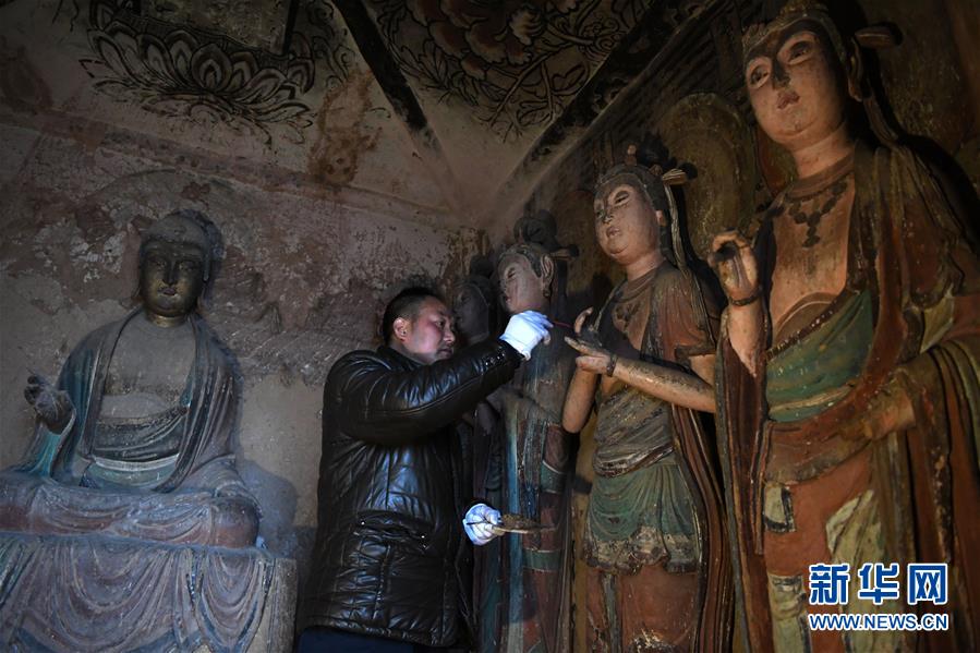 12月25日,在麥積山石窟第11窟,修復(fù)師牟常有對塑像破損處進行加固處理。